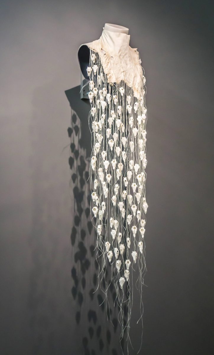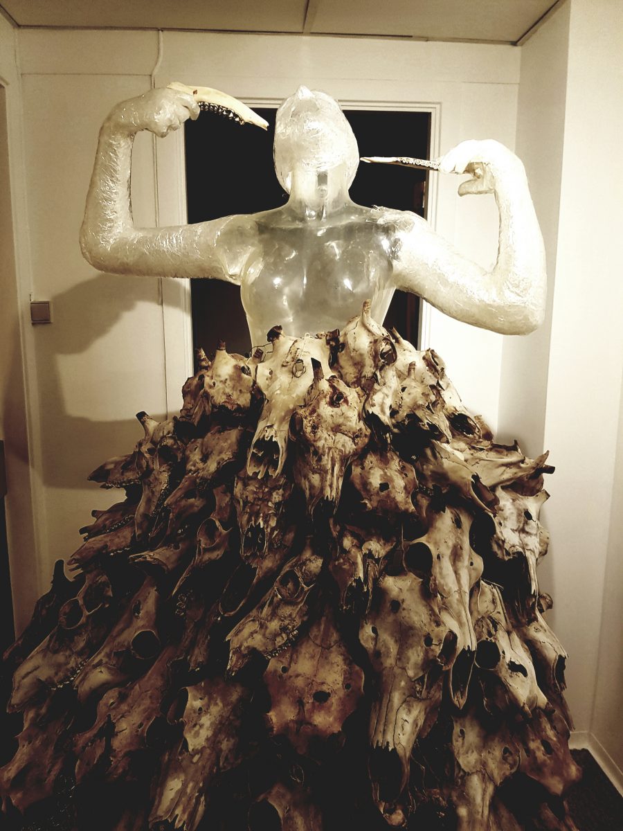 A collaborative Pile o´ Sápmi piece by Maret Anne Sara and Matt Lambert. The collar is made of the jaws from the heads Sara has been collecting and cared for during the years of her brothers legal battle against the Norwegian government to protect the family´s reindeer and rights. The piece was made in Kautokeino, 2018. Photo: Maret Anne Sara