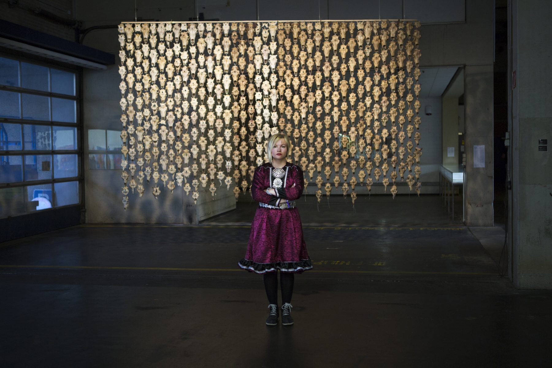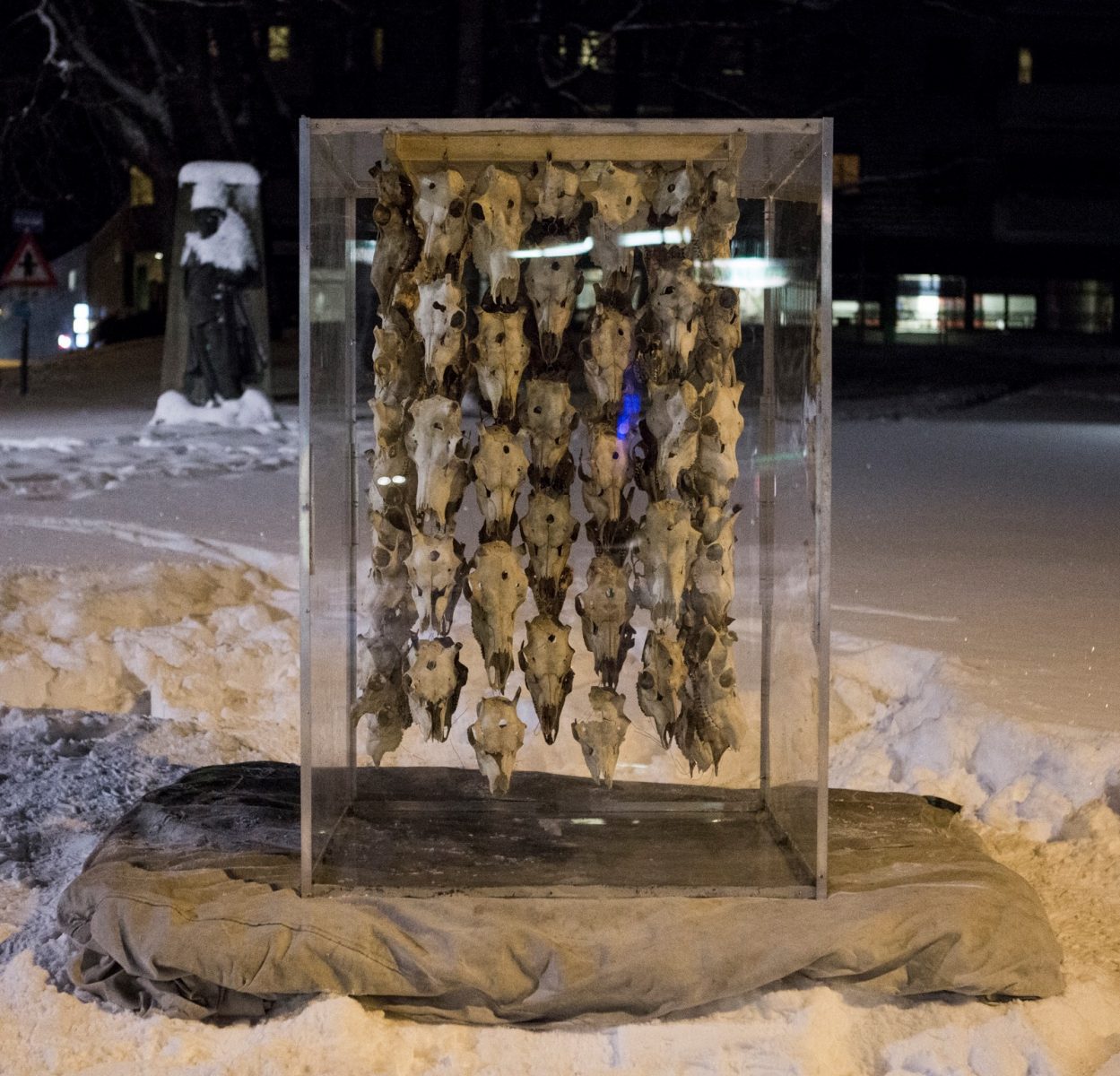 PILE O´SÁPMI-SUPREME, EIDSVOLLS PLASS OSLO, DECEMBER 2017 09 AM, as Jovsset Ante Sara entered the Norwegian Supreme Court, sister Máret Ánne Sara gathered artists and activists to Oslo and raised the Pile o´Sápmi-Supreme installation outside the Norwegian Parliament. The curtain made of 400 bullet ridden reindeer skulls, hung publicly in the power center of Norway during the two days of trial, as support for Jovsset Ante Sara and other reindeer sámis who end up with enormous burdens because of misappropriated policies. Also to signal to politicians and people that politics and law cannot freely be adjusted according to state interests, regardless of the people, culture and rights that the Sami people are entitled to in the same way as everyone else. Artist Maret Anne Sara is especially adressing the new colonial systematical practices taking place in fair democracies such as Norway. Photo: Matti Aikio