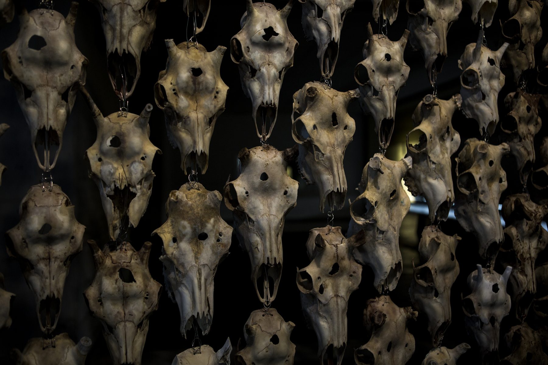 Pile o´Sápmi at Documenta 14, Kassel 2017. The piece of 400 bullet ridden reindeer heads, hung up as the Sámi flag, was later raised outside the Norwegian Parliament as Saras brother entered the Norwegian supreme court for the final decission of his case. After two victories and two serious verdicts stating abuse on the young reindeerherders human rights and indigenous rights, the Norwegian supreme court rejected the existing legal argumentations and went in favour of the States political arguments. Sara lost the case. Photo: Matti Aikio